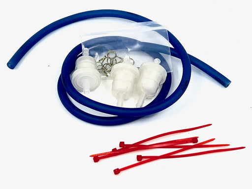 Bensinslange (1 m), 3 bensinfiltre, 10 slangeklemmer og strips.