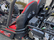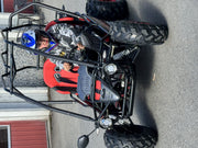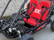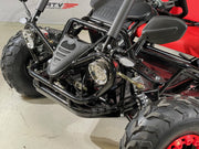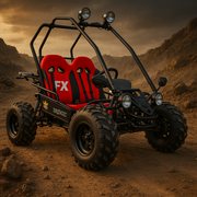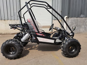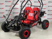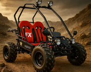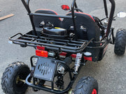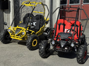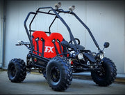 Ny tøff og morsom 125cc CrossKart som størrelsesmessig passer best for aldersgruppen 7-12 år +/-. Her sitter man godt beskyttet og med svært lavt tyngdepunkt (nærmest umulig å velte med). Plass til 2 personer (barn/ungdom). Setene kan justeres frem inntil ca. 15 cm om ønskelig (justering under setet som på en bil). Gass, bremse og gir som på en vanlig bil. Dette kjøretøyet har en kraftig 125cc Honda-type motor med 3 gir fremover - fri og revers. Giret har automatclutch, dvs. at man slipper å gire. Hydrauliske bremser både fremme og bak. NB! Denne leveres nå standard med store asymetriske 8" hjul (smale fremme og breie bak) derfor er prisen økt noe i forhold til tidligere modell som ble levert med 7" felger og dekk med vesentlig dårligere mønster. Noen av bildene viser denne med 7" hjul, men det er nå store asymetriske 8" hjul på alle modellene vi selger!