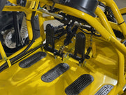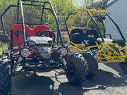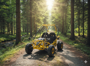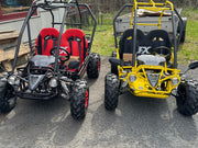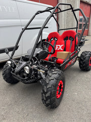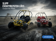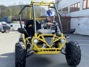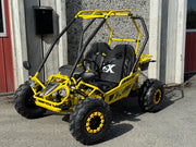 Ny tøff og morsom 125cc CrossKart som størrelsesmessig passer best for aldersgruppen 7-12 år +/-. Her sitter man godt beskyttet og med svært lavt tyngdepunkt (nærmest umulig å velte med). Plass til 2 personer (barn/ungdom). Setene kan justeres frem inntil ca. 15 cm om ønskelig (justering under setet som på en bil). Gass, bremse og gir som på en vanlig bil. Dette kjøretøyet har en kraftig 125cc Honda-type motor med 3 gir fremover - fri og revers. Giret har automatclutch, dvs. at man slipper å gire. Hydrauliske bremser både fremme og bak. NB! Denne leveres nå standard med store asymetriske 8" hjul (smale fremme og breie bak) derfor er prisen økt noe i forhold til tidligere modell som ble levert med 7" felger og dekk med vesentlig dårligere mønster. Noen av bildene viser denne med 7" hjul, men det er nå store asymetriske 8" hjul på alle modellene vi selger!
